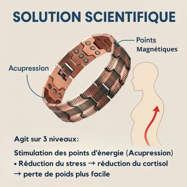 Le bracelet de thérapie magnétique stimule la circulation sanguine et énergétique grâce à des aimants stratégiquement placés. Une meilleure circulation aide votre corps à brûler les calories plus efficacement et à transformer les graisses stockées en énergie utilisable.